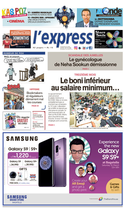 À la une: treizième mois – le boni inférieur au salaire minimum… Autre titre: le gynécologue de Neha Sookun démissionne