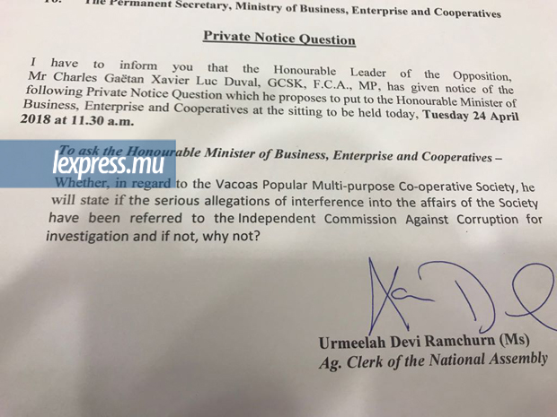 Le sujet : les ingérences ministérielles dans la Vacoas Popular Multipurpose Cooperative Society (VPMCS).