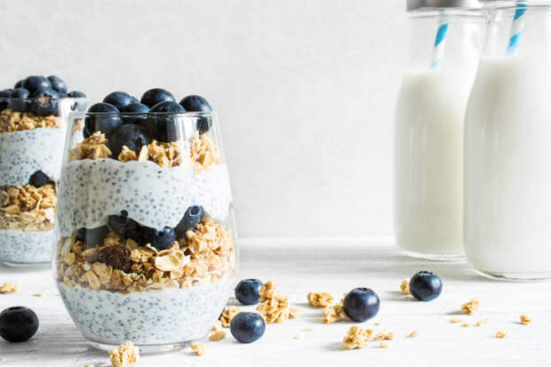 Tout comme les graines de toukmaria, les graines de chia gonflent au contact de l’eau, du lait ou de tout autre liquide. Le gel alors formé peut remplacer les œufs dans les recettes véganes, ou tout simplement être consommé tel quel, avec des fruits, un yaourt ou un smoothie en cas de petite fringale en milieu de journée.
