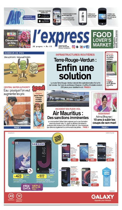 En Une : Terre-Rouge–Verdun – Une solution enfin trouvée. Autres titres : Eau - pourquoi augmenter les prix ? Incident sur un vol d’Air Mauritius : des sanctions imminentes à prévoir