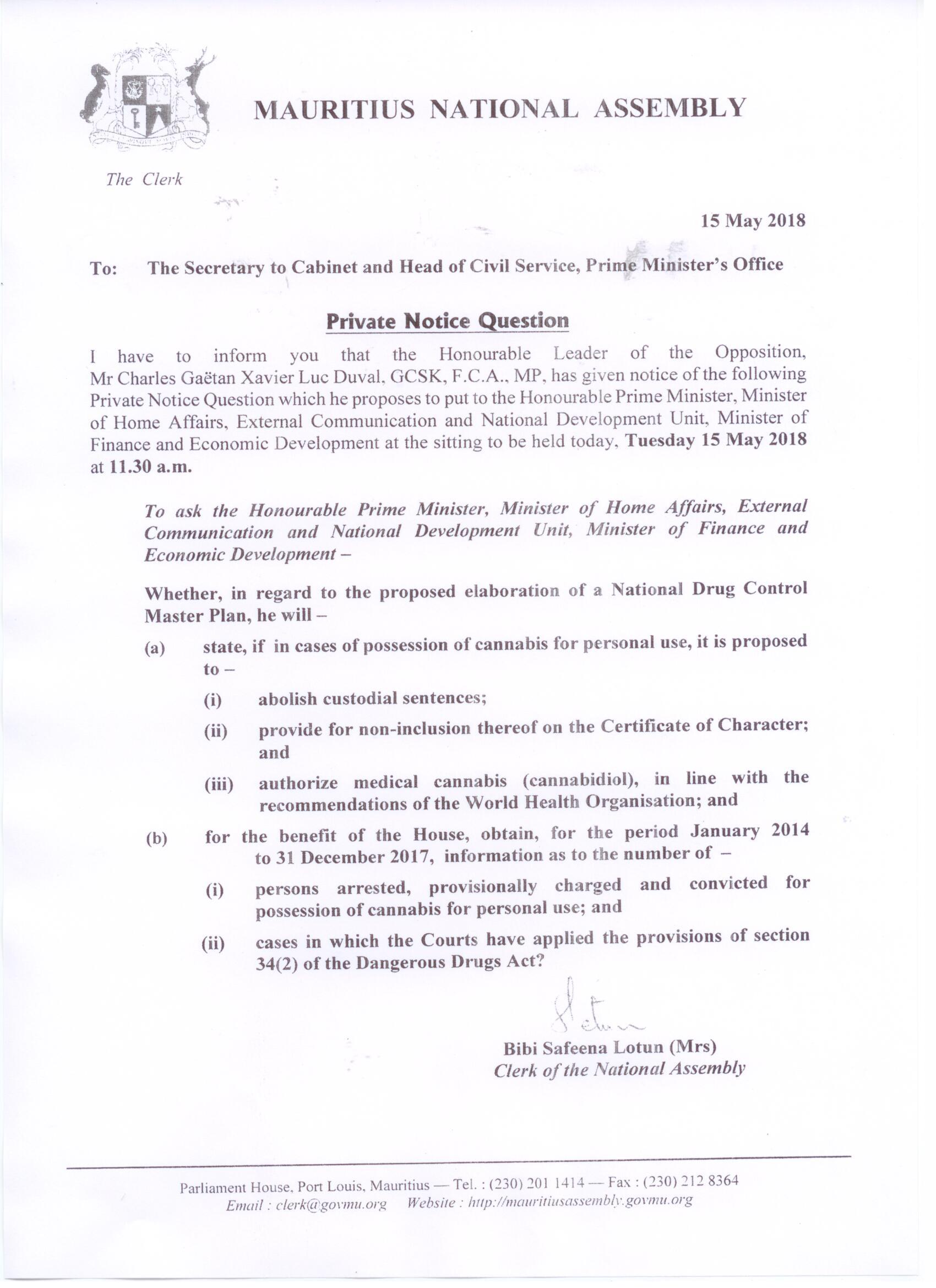 Le leader de l’opposition s’intéresse aux consommateurs de cannabis. Plus précisément, à leur incarcération. Lors de sa Private Notice Question (PNQ), ce mardi 15 mai, Xavier-Luc Duval voudra savoir du Premier ministre si le Drug Control Masterplan proposera l’abolition des peines de prison aux fumeurs de gandia et leur insertion.
