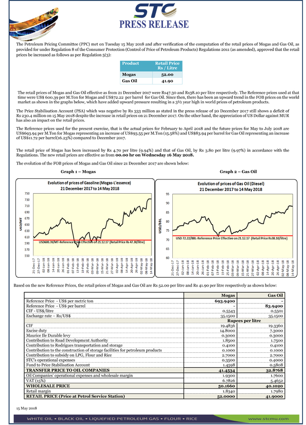 Les nouveaux prix des carburants prennent effet à partir de minuit, ce soir, mardi 15 mai. Le litre d’essence passe à Rs 52 et le diesel à Rs 41,90. Décision du Petroleum Pricing Committee qui s’est réuni aujourd’hui.