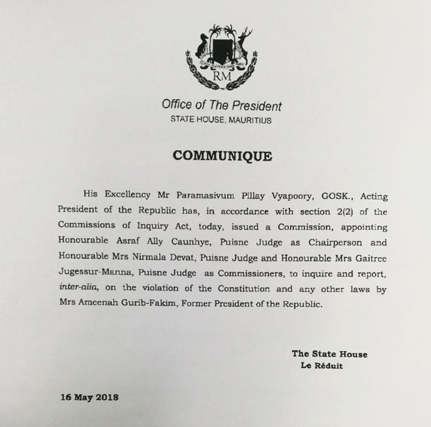 Le juge Caunhye aura pour assesseurs Nirmala Devat, Puisne Judge et Gaitree Jugessur-Manna, également Puisne Judge. Les attributions de la Commission d’enquête : déterminer si Ameenah Gurib-Fakim a violé la Constitution et toute autre loi.