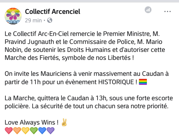 Dans un post publié sur Facebook vendredi soir, le collectif Arc-en-Ciel remercie le Premier ministre et le commissaire de police d’autoriser la Marche des Fiertés. «Nous demandons aux citoyens qui souhaitent défendre la liberté d’expression, la liberté d’exister, de venir massivement au Caudan», déclare Pauline Verner, consultante du collectif Arc-en-ciel.