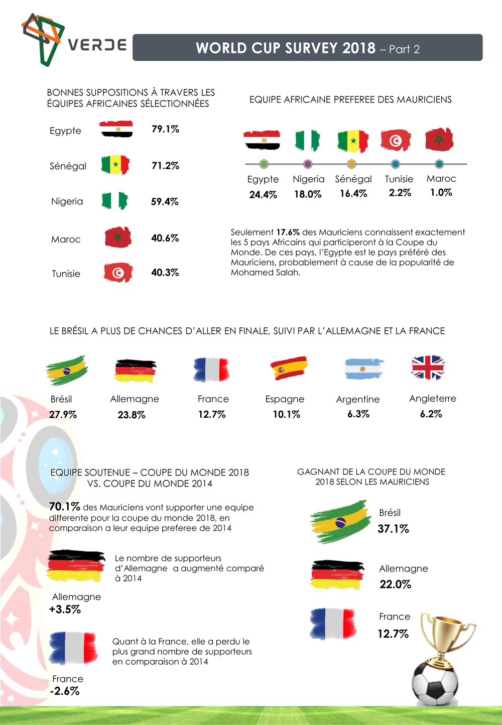 Selon les Mauriciens, la coupe de cette année sera remise au Brésil, ayant obtenu 37,1 % de votes. Quant à l’Allemagne, les supporteurs l’ont nommé deuxième avec 22,0 % de votes, suivi de la France (12,7 %), l’Espagne (7,2 %), Argentine (5,8 %) et Angleterre (6,5 %).