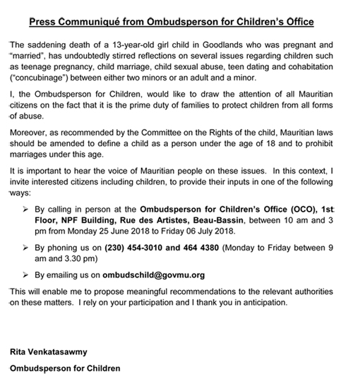 «The saddening death of a 13-year-old girl child in Goodlands who was pregnant and “married”, has undoubtedly stirred reflections on several issues regarding children such as teenage pregnancy, child marriage, child sexual abuse, teen dating and cohabitation (“concubinage”) between either two minors or an adult and a minor», écrit Rita Venkatasawmy dans un communiqué de presse ce vendredi 22 juin.
