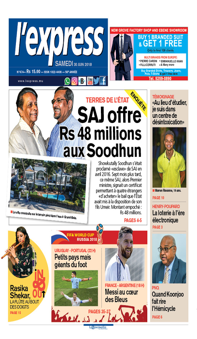 En Une, SAJ offre Rs 48 millions aux Soodhun. Autre titre: Warren Ravanne, aujourd’hui en désintoxication, nous raconte l’enfer qu’il a vécu.