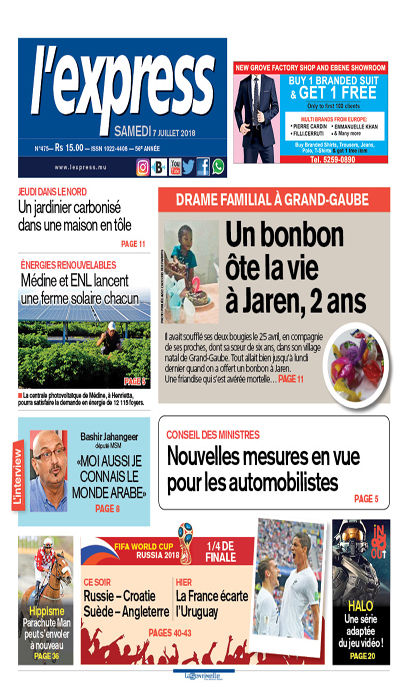 En une de l’express : Un bonbon ôte la vie à Jaren, 2 ans, à Grand-Gaube. Autre titre: «Moi aussi
