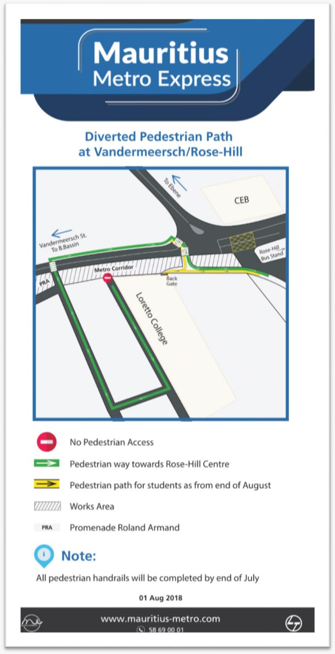 Dans le sillage du projet Metro Express, la circulation à Rose-Hill et dans les régions avoisinantes a complètement changé, et pas que pour les automobilistes. Des passages pour piétons temporaires ont été aménagés pour permettre aux usagers de la route de circuler facilement autour du chantier tout en évitant les dangers. A Vandermeersch et dans le centre de la ville, des panneaux de signalisation et de direction ont été installés pour guider le public. Des flyers ont été distribués au public, surtout aux jeunes, aujourd’hui.