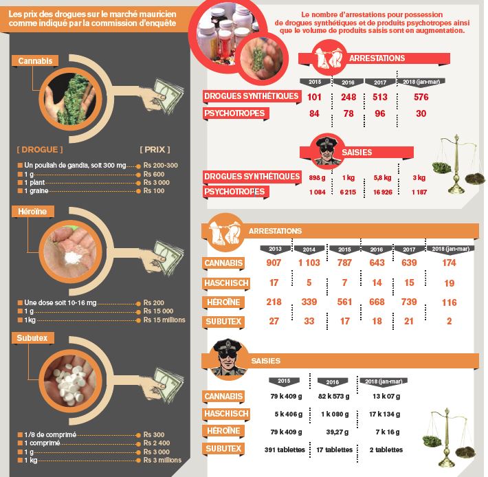 Le rapport de la commission drogue, rendu public le vendredi 27 juillet, contient de nombreuses informations sur le trafic de drogue à Maurice. Il donne une indication des prix réclamés par les trafiquants aux consommateurs de drogue ainsi que le nombre d’arrestations et les saisies de produits illicites. Selon le rapport Lam Shang Leen, les sept drogues les plus présentes à Maurice sont : le cannabis, l’héroïne, le Subutex, les drogues synthétiques, le haschisch, la cocaïne et les produits psychotropes.