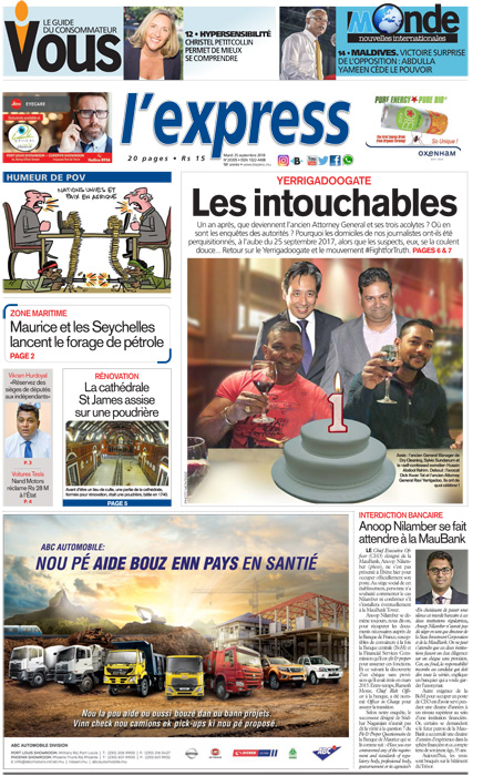 En une : Yerrigadoogate – Les intouchables ; Interdiction bancaire – Anoop Nilamber se fait attendre à la MauBank ; Zone maritime – Maurice et Seychelles lancent le forage de pétrole ; Vikram Hurdoyal – «Réservez des sièges de députés aux indépendants»