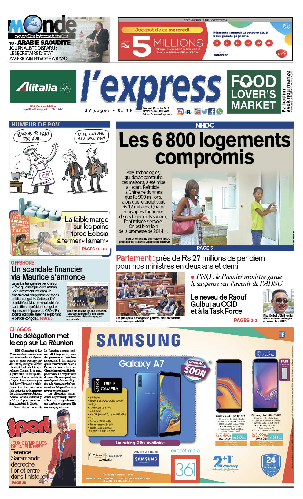 En une : NHDC – Les 6800 logements compromis ; Parlement – près de Rs 27 millions de per diem pour nos ministres en deux ans et demi ; Offshore – Un scandale financier s’annonce