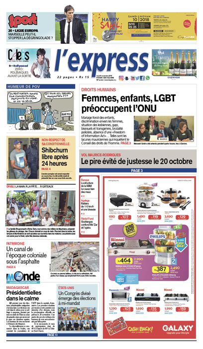En Une : l’ONU se préoccupe de la situation des femmes, des enfants et des LGBT. Autre titre : la main à la pâte… à gâteaux à l’occasion de la fête Divali. Ou encore Shibchurn libre après avoir été arrêté pour non-respect de sa conditionnelle.