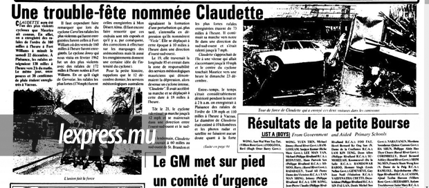 Beryl. C’est le nom du cyclone qui est passé à 30 kilomètres au nord de Maurice en 1961, du 22 au 26 décembre. Dix-huit ans plus tard, c’est Claudette qui a volé la vedette, en 1979. Il est passé directement sur Maurice du 21 au 23 décembre. Claudette, qui hante aujourd’hui encore la mémoire des anciens, a fait quatre morts. Deux des victimes, âgées d’une cinquantaine d’années, avaient péri lors d’un incendie à Rose-Hill. Une personne était morte noyée à Le Hochet, Terre-Rouge. La quatrième victime était une mineure de 14 ans. La maison dans laquelle elle se trouvait s’était effondrée à Curepipe. Le rapport de la police rédigé à l’époque indique que 2 560 personnes se trouvaient alors dans les différents centres de refuge.