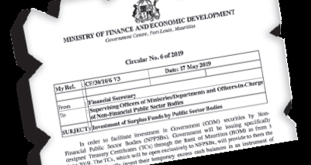 Signée par le secrétaire financier, Dev Manraj, cette correspondance invite la Banque de Maurice (Bank of Mauritius – BoM) à émettre des certificats de trésorerie exclusivement aux corps para-étatiques engagés dans des activités commerciales. Et à ceux-ci de les acheter pour éponger le surplus de liquidités qui se chiffre à plusieurs milliards de roupies. Les certificats de trésorerie sont des titres de l’État, qui, comme les bons du Trésor, sont un emprunt émis par celui-ci. La seule différence est le mode de calcul du taux d’intérêt.