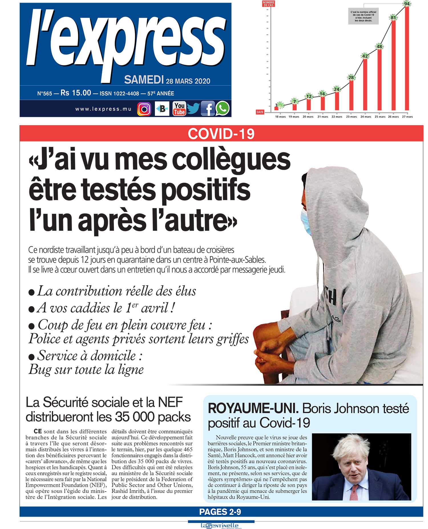 En une de l'express de ce samedi 28 mars: Covid-19: «J’ai vu mes collègues être testés positifs l’un après l’autre» ; Autre titre: Royaume-Uni: Boris Johnson testé positif au Covid-19.