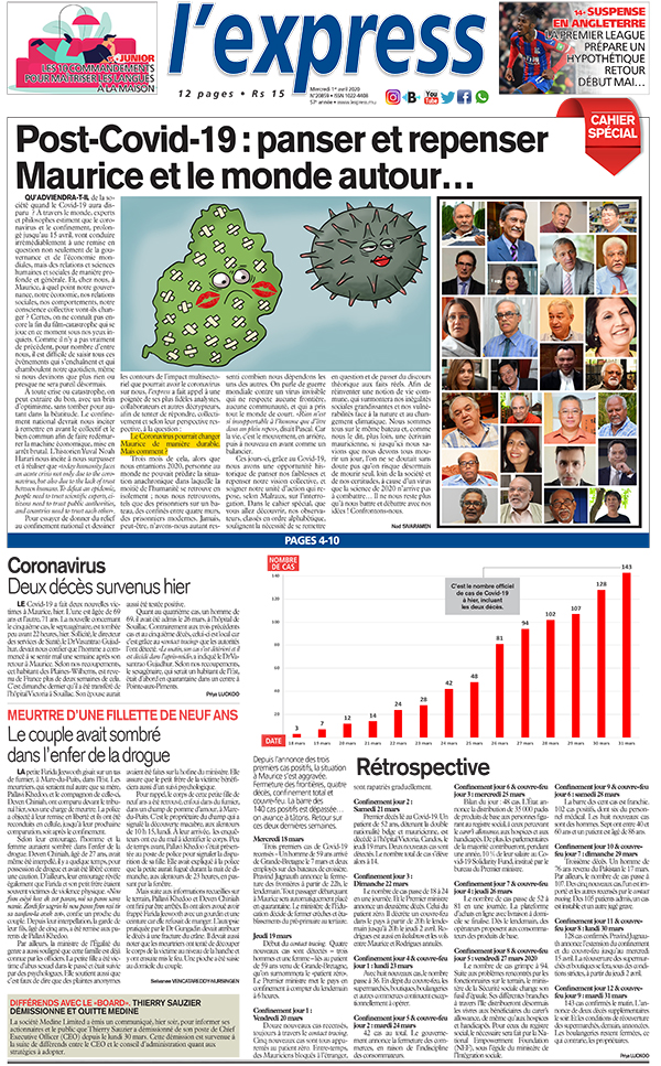 En une de l'express de ce mercredi 1er avril ; Post-Covid-19: panser et repenser Maurice et le monde autour... Autre titre: Coronavirus: deux décès survenus hier.