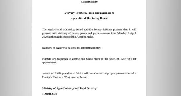 La distribution des semences de pomme de terre, oignon et ail se fera dans les locaux de l’Agricultural Marketing Board (AMB) à Moka à partir du lundi 6 avril. Les planteurs sont priés de prendre rendez-vous en appelant sur le 52547584 avant de s’y rendre.