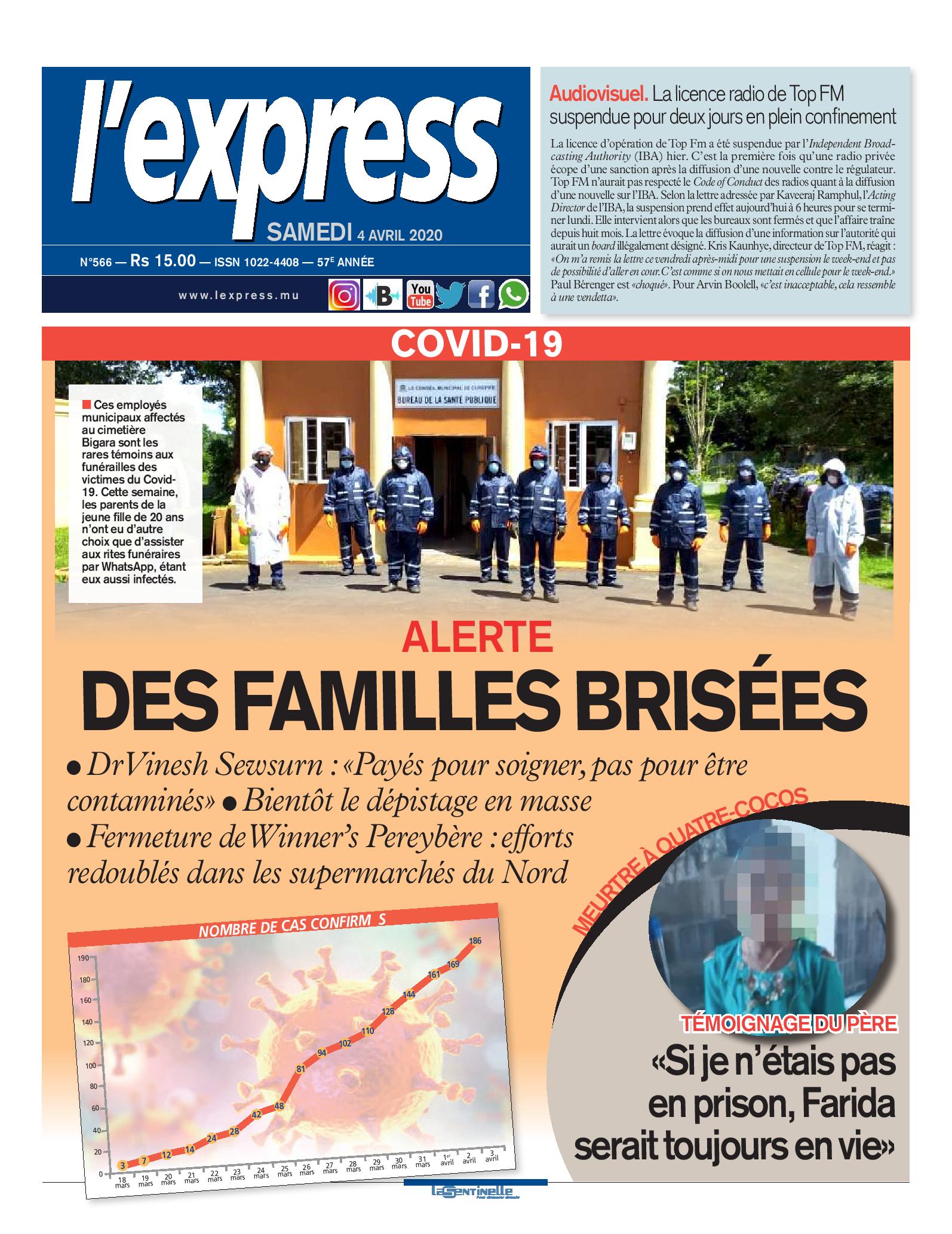 En une : Covid-19 – Alerte: Des familles brisées ; Meurtre à Quatre-Cocos - Témoignage du père ; Dr Vinesh Sewsurn : «Payés pour soigner, pas pour être contaminés» ; Bientôt le dépistage en masse ; Fermeture de Winner’s Péreybère : efforts redoublés dans les supermarchés du Nord.