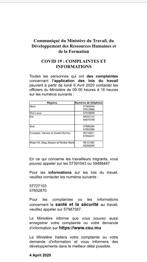 A partir de demain, lundi 6 avril, les officiers du ministère du travail enregistreront les plaintes concernant l’application des droits du travail par téléphone. C’est ce qui ressort d’un communiqué émis par le ministère hier. Un numéro a aussi été mis en place pour les questions relatives à la santé et la sécurité au travail.