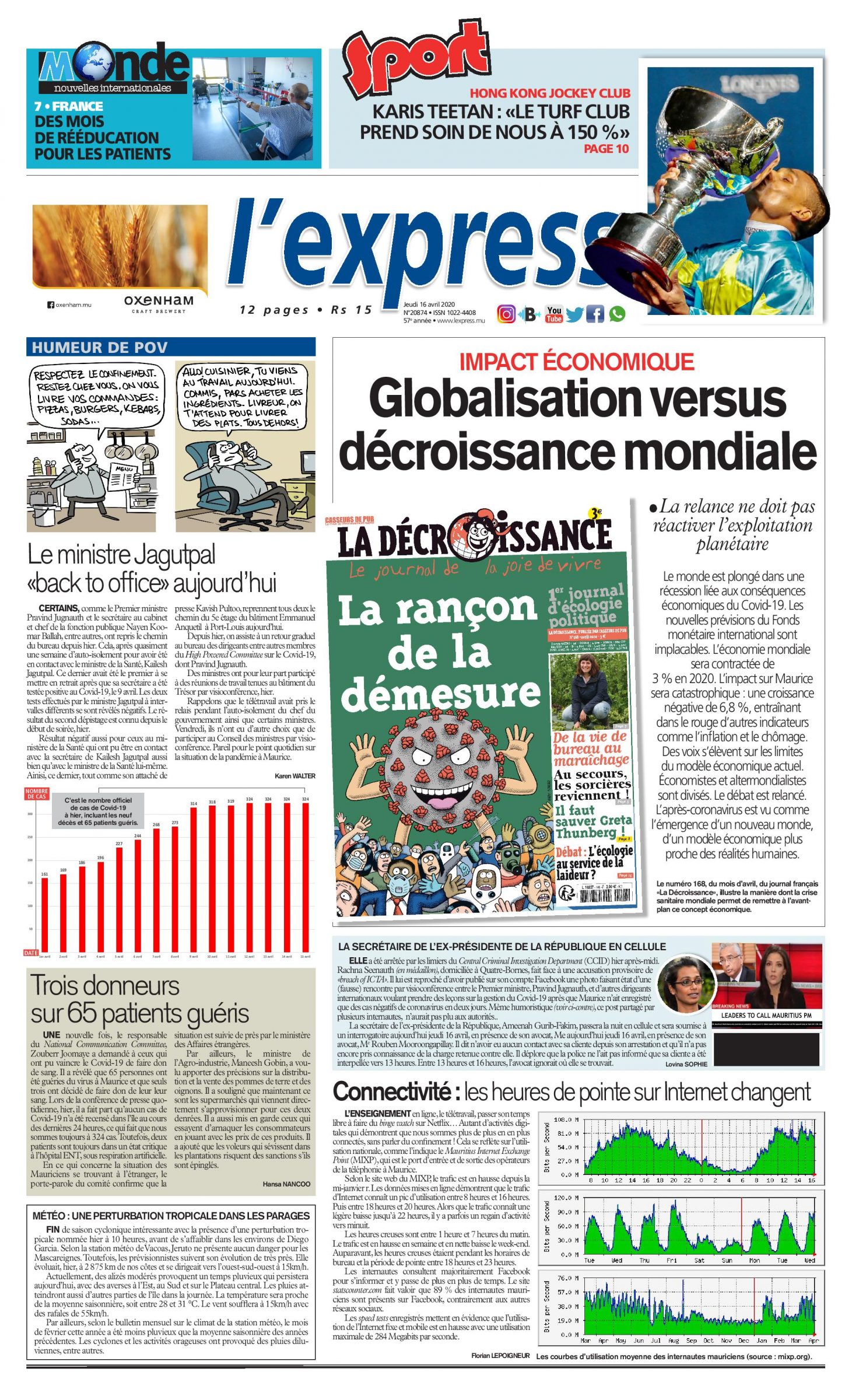L'express du jeudi 16 avril: la une est consacrée à la décroissance mondiale et la globalisation; Autre titre: Trois donneurs sur 65 patients guéris.