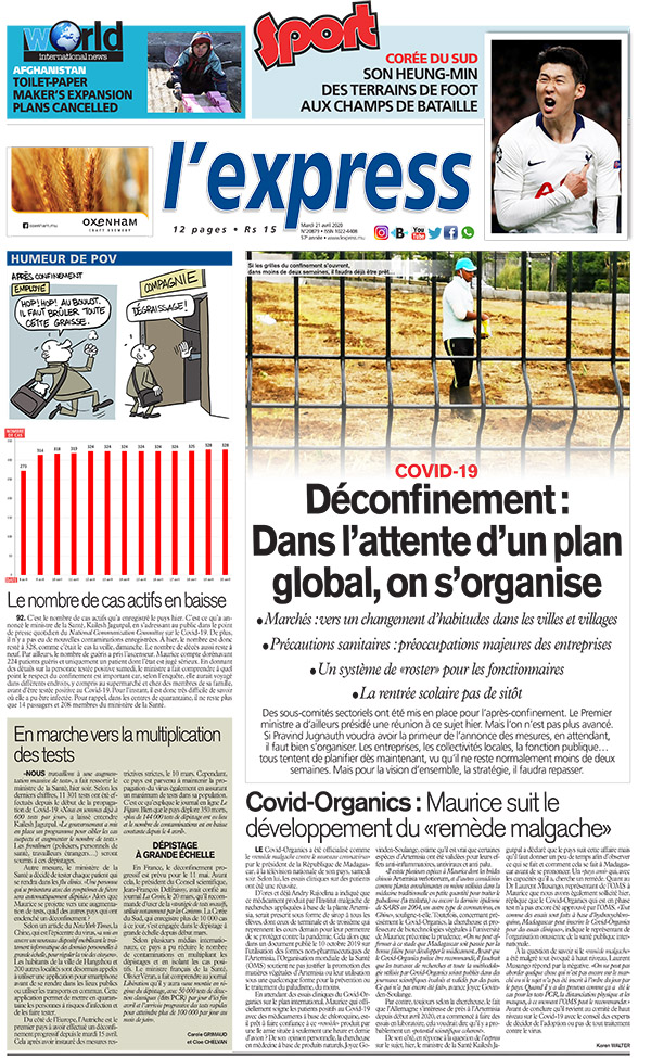 En une de l'express de ce mardi 21 avril 2020 ; Covid-19 - Déconfinement : dans l’attente d’un plan global, on s’organise ; Autre titre: Covid-19: le nombre de cas actifs en baisse.