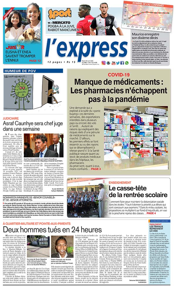 En une de l'express de ce mardi 28 avril ; Covid-19 - Manque de médicaments: les pharmacies n’échappent pas à la pandémie ; Autre titre: Covid-19: Maurice enregistre son dixième décès.