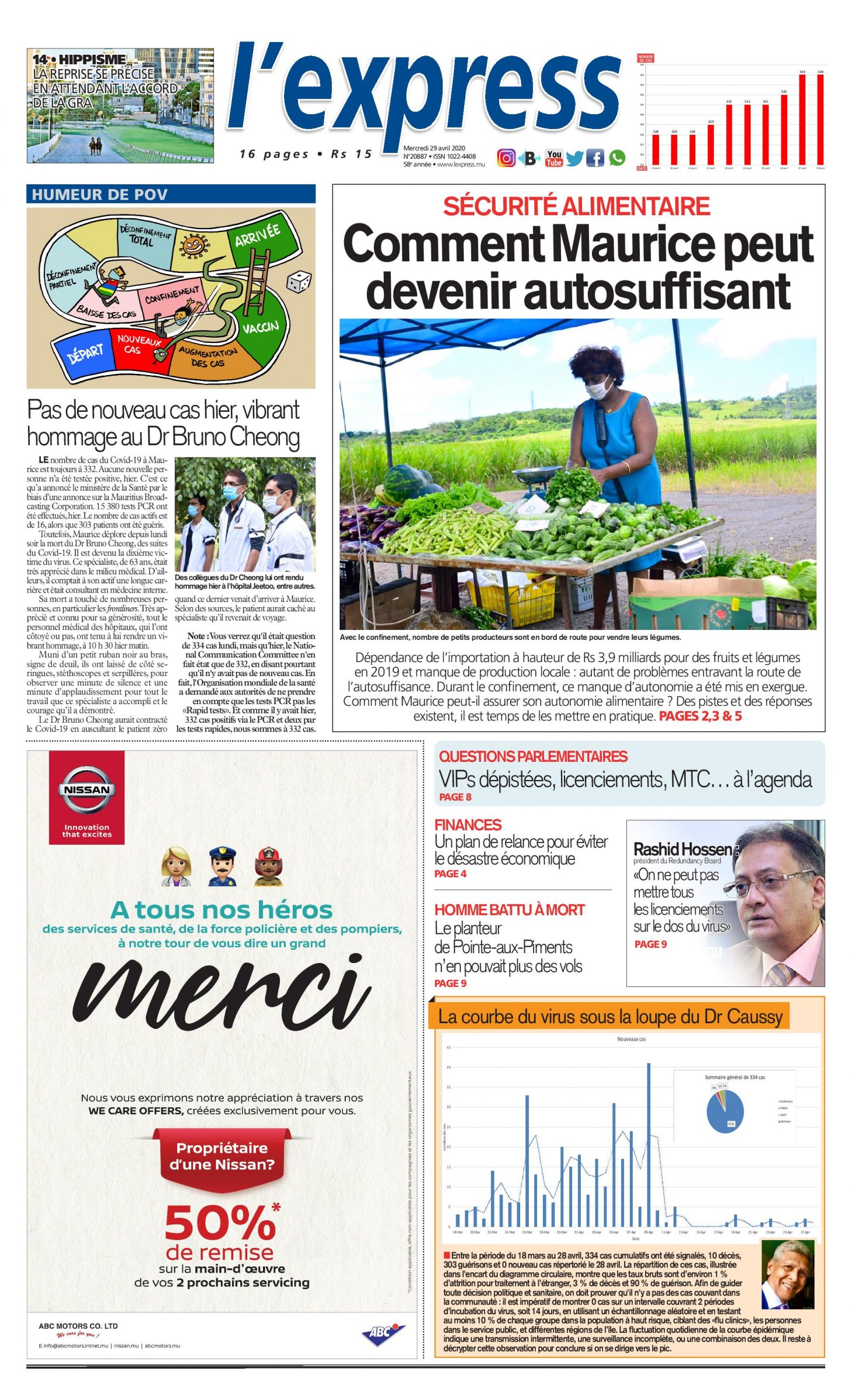 En une de l'express de ce mercredi 29 avril ; Sécurité alimentaire: Comment Maurice peut devenir autosuffisant ; Autre titre: Pas de nouveau cas hier, vibrant hommage au Dr Bruno Cheong