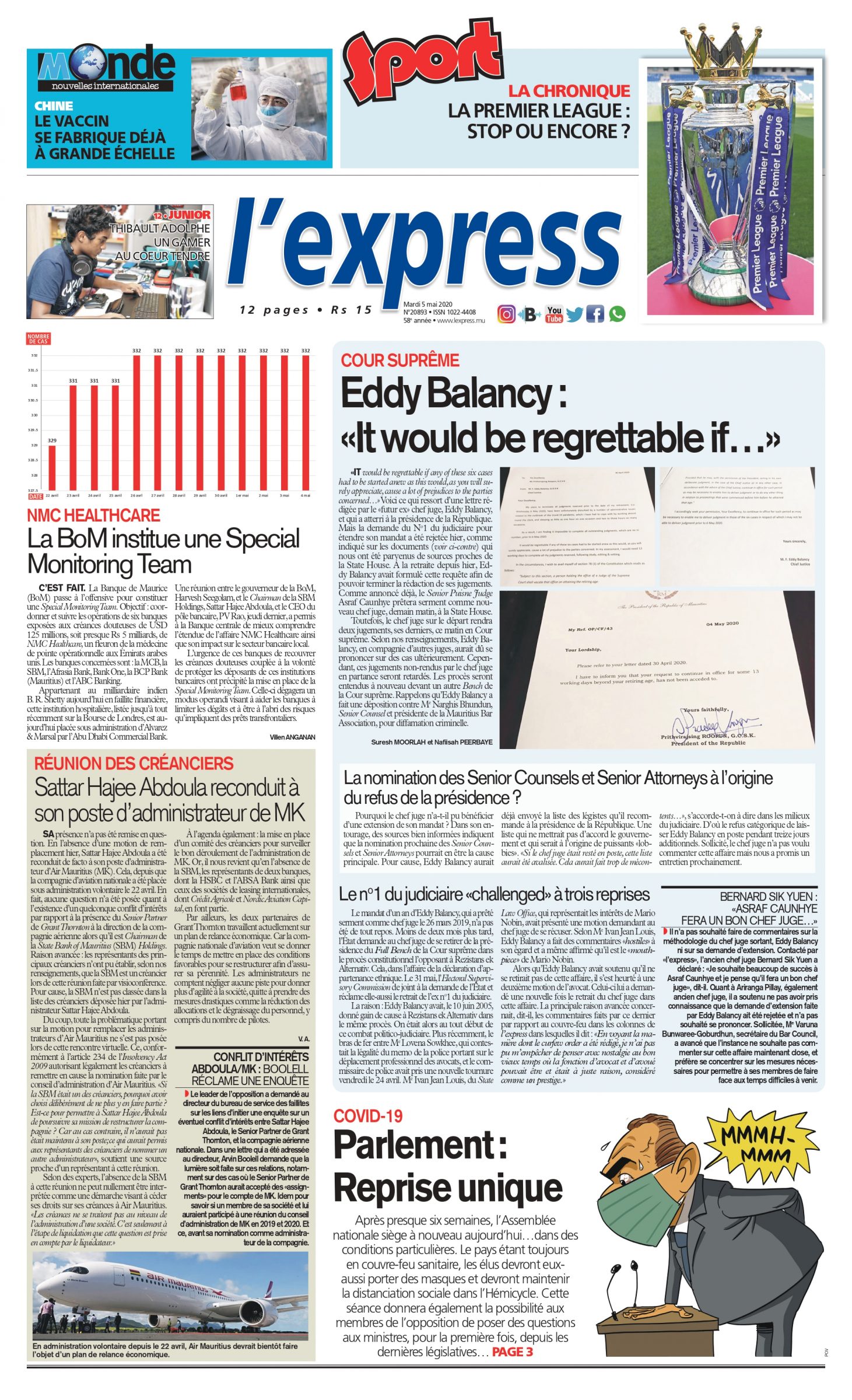 En une de l'express de ce mardi 5 mai. La demande d'extension d'Eddy Balancy rejetée, il prend sa retraite. Autre titre: Parlement: Reprise dans des conditions spéciales aujourd'hui