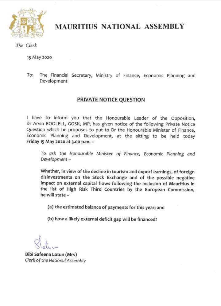 Ci-dessous la PNQ, qui débutera la séance du Parlement, à 15 heures. Les débats et le vote du Covid-19 Bill et du Quarantine Bill suivront :