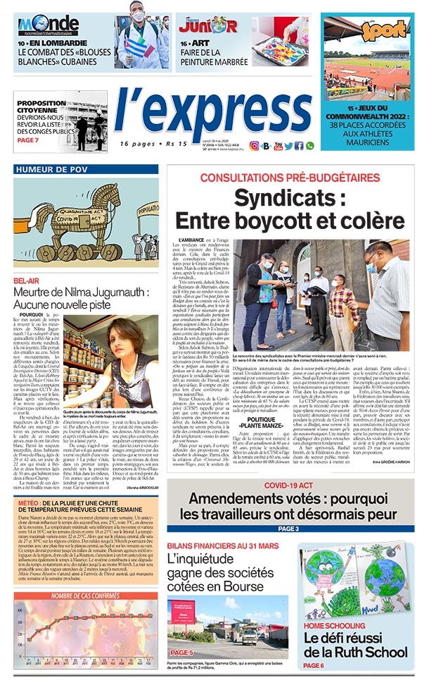 En une de l'express : Consultations pré-budgétaires - Syndicats: Entre boycott et colère ; Autre titre : Bel-Air - Meurtre de Nilma Jugurnauth: Aucune nouvelle piste.