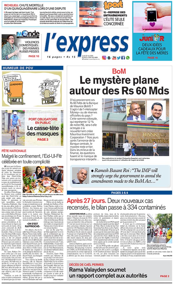En une de l'express: BoM: Le mystère plane autour des Rs 60 Mds ; Autre titre: Fête nationale: Malgré le confinement, l’Eid-Ul-Fitr célébrée en toute complicité.