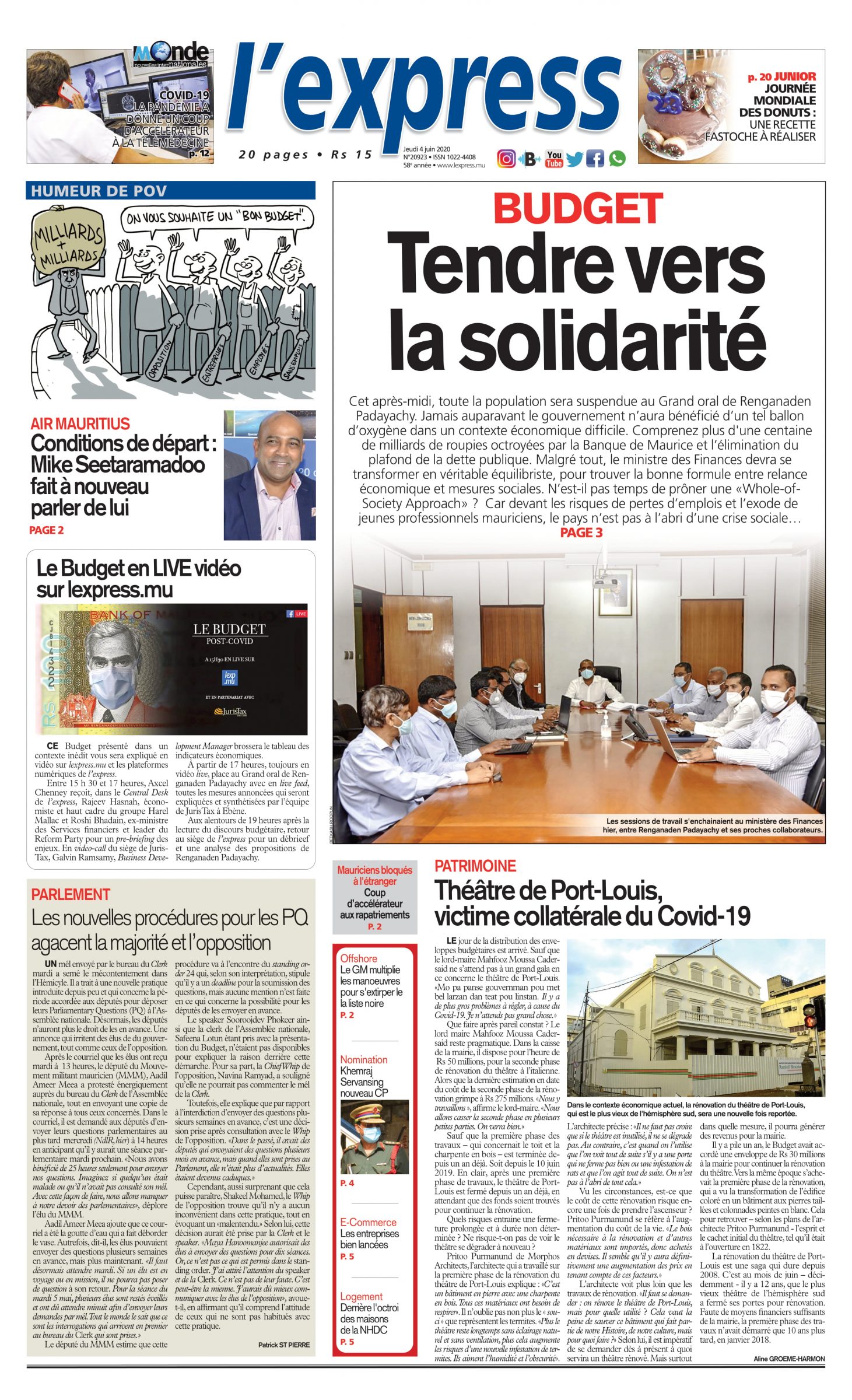 En une de l'express; Budget: Tendre vers la solidarité; Autre titre: Théâtre de Port-Louis, victime collatérale du Covid-19;Le Budget en LIVE vidéo sur lexpress.mu.