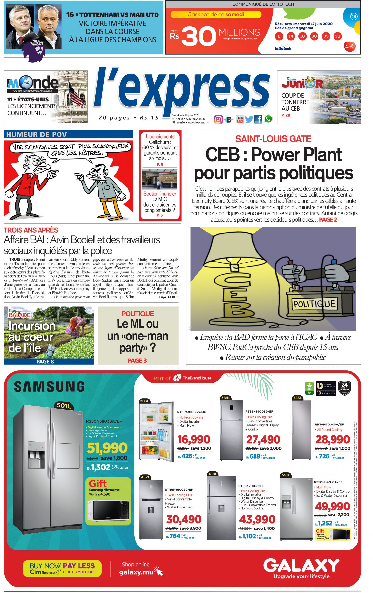 En une de l'express: Saint-Louis Gate CEB : Power Plant pour partis politiques ; Autre titre: Affaire BAI : Arvin Boolell et des travailleurs sociaux inquiétés par la police.