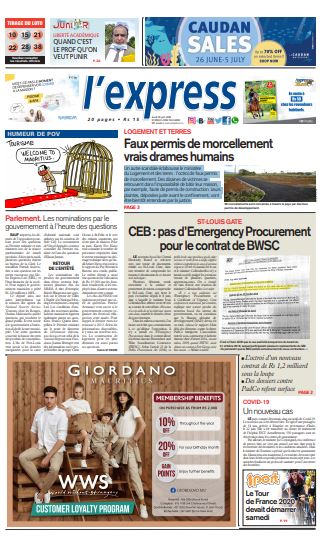 En une de l'express: St-Louis Gate : CEB : pas d’Emergency Procurement pour le contrat de BWSC ; Autre titre: Logement et terres : Faux permis de morcellement vrais drames humains.