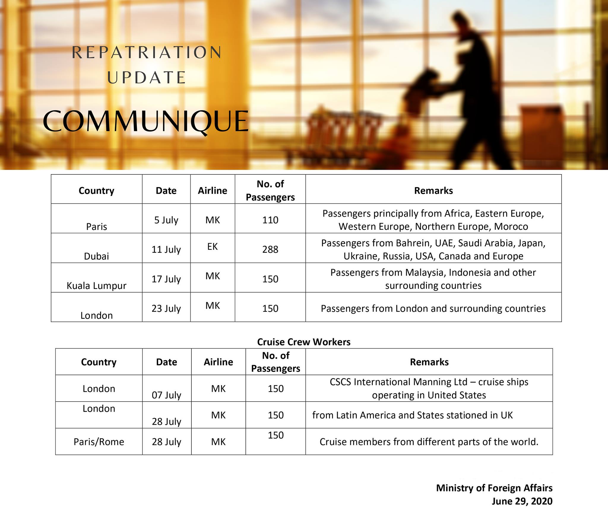 Le communiqué émanant du ministère des Affaires étrangères a été émis en ce lundi 29 juin. Le document laisse comprendre qu’un plan a déjà été élaboré pour le mois de juillet, l’objectif étant de rapatrier 1 400 personnes durant cette période.
