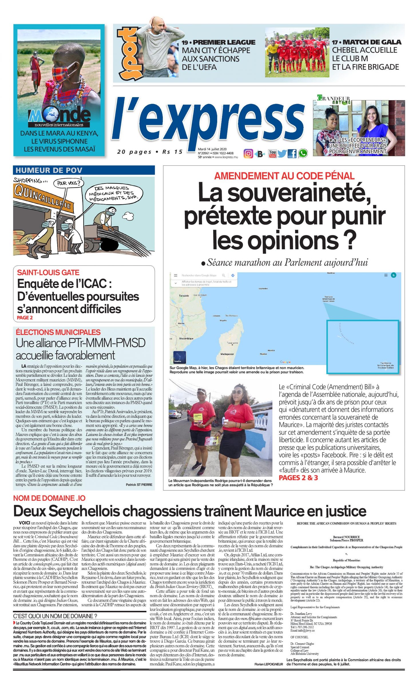 En une de l'express: Amendement au Code pénal : La souveraineté, prétexte pour punir les opinions ? ; Autre titre : Enquête de l’ICAC : D’éventuelles poursuites s’annoncent difficiles.