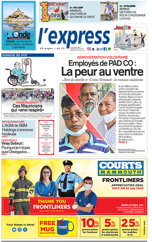 En une de l'express: Administration volontaire-Employés de PAD CO: La peur au ventre; Autre titre : Rassemblement : ces Mauriciens qui «anvi respiré».