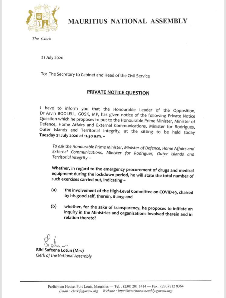 Ce mardi 21 juillet, Arvin Boolell addressera sa Private Notice Question au Premier ministre. Pravind Jugnauth sera interrogé sur les procédures d’urgence pour l’achat des équipements médicaux et de médicaments.