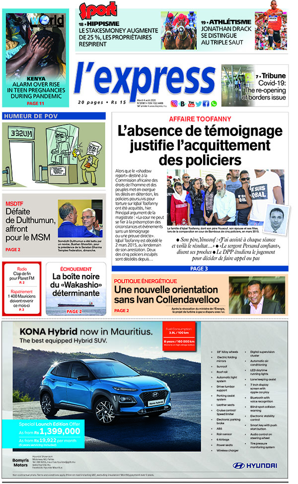 En un de l'express: Affaire Toofanny: L’absence de témoignage justifie l’acquittement des policiers ; Autre titre : MSDTF: défaite de Dulthumun, affront pour le MSM.