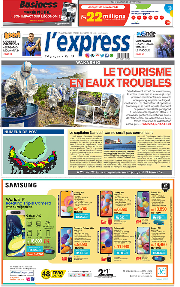 En une de l'express: Wakashio: le tourisme en eaux troubles ; Autre titre : Le capitaine Nandeshwar ne serait pas convaincant.