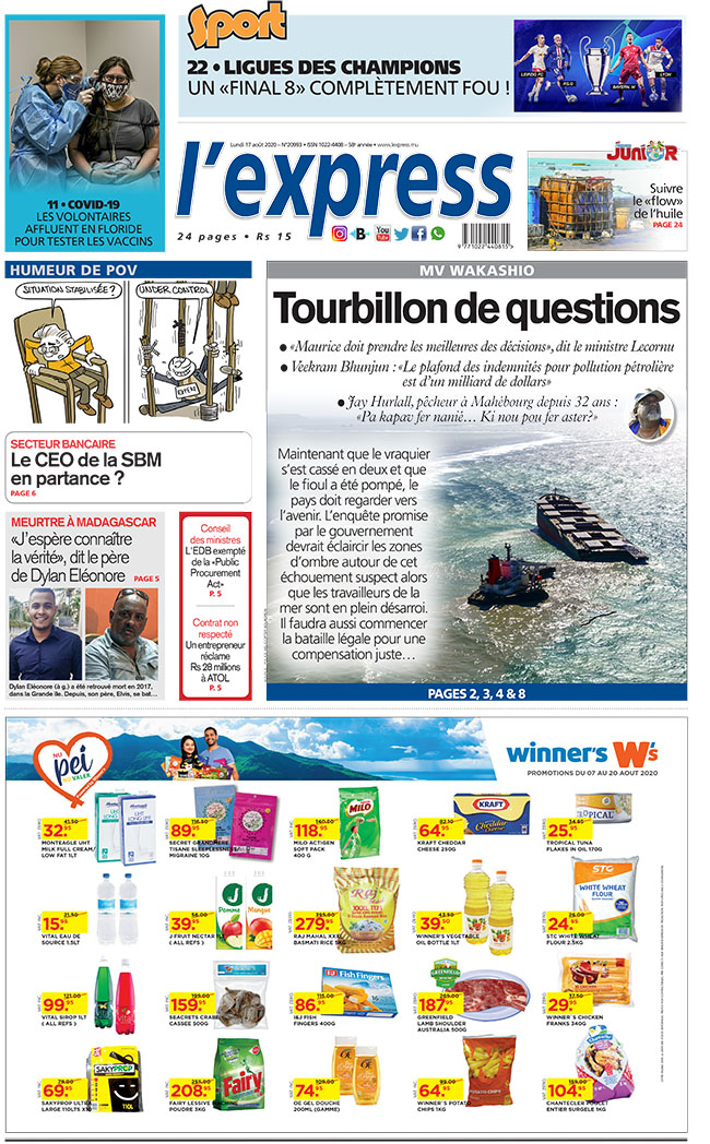 En un de l'express: MV Wakashio : Tourbillon de questions; Autre titre: Secteur bancaire : Le CEO de la SBM en partance ?