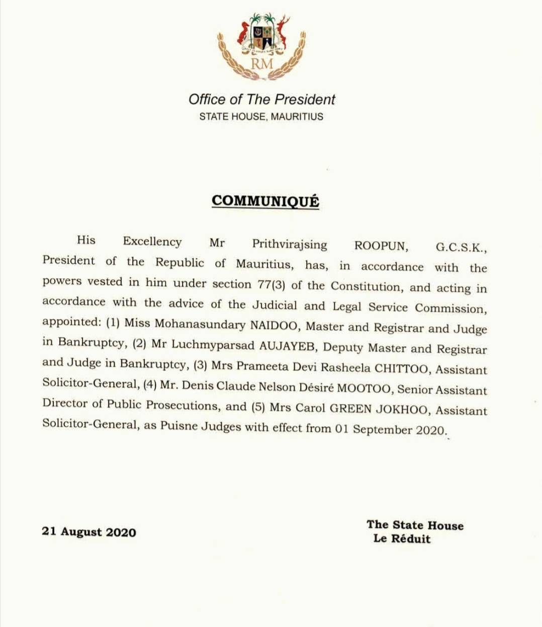 Le President nommé cinq nouveaux Puisne Judges aujourd’hui. Il s’agit de trois femmes et de deux hommes qui occupent de hautes fonctions dans le judiciare.