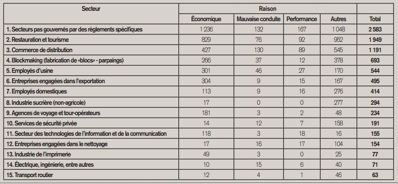De janvier à juillet, 9 529 licenciements ont été rapportés dans différents secteurs. Le ministère du Travail en dénombre 32. Le plus grand nombre de renvois est répertorié dans des secteurs qui ne sont pas gouvernés par des règlements spécifiques. Les employés ne sont pas couverts par la «Workers Rights Act». On vous propose le «Top 15» des secteurs ayant licencié le plus durant les sept premiers mois de l’année.