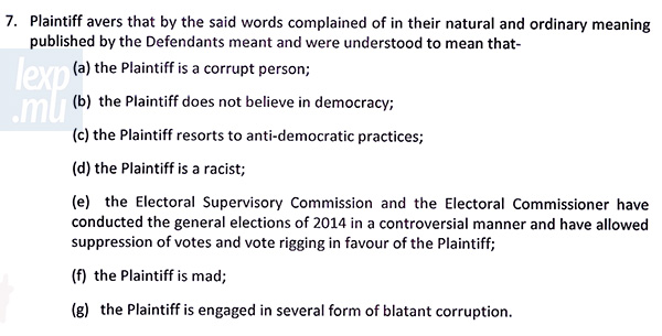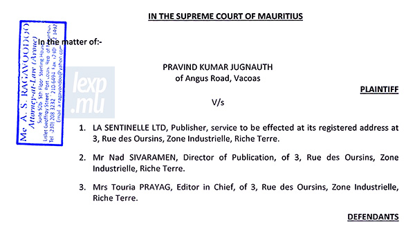Le 31 juillet 2020, cette fois-ci, par l’intermédiaire de l’avouée Sharmila Sonah-Ori, le Premier ministre avait dirigé une plainte en réclamation de Rs 25 millions contre Nad Sivaramen, directeur des publications ; La Sentinelle, propriétaire-imprimeur de l’express ; Anenden Camatchee, Senior Digital Coordinator ; et Impress Print Co Ltd.