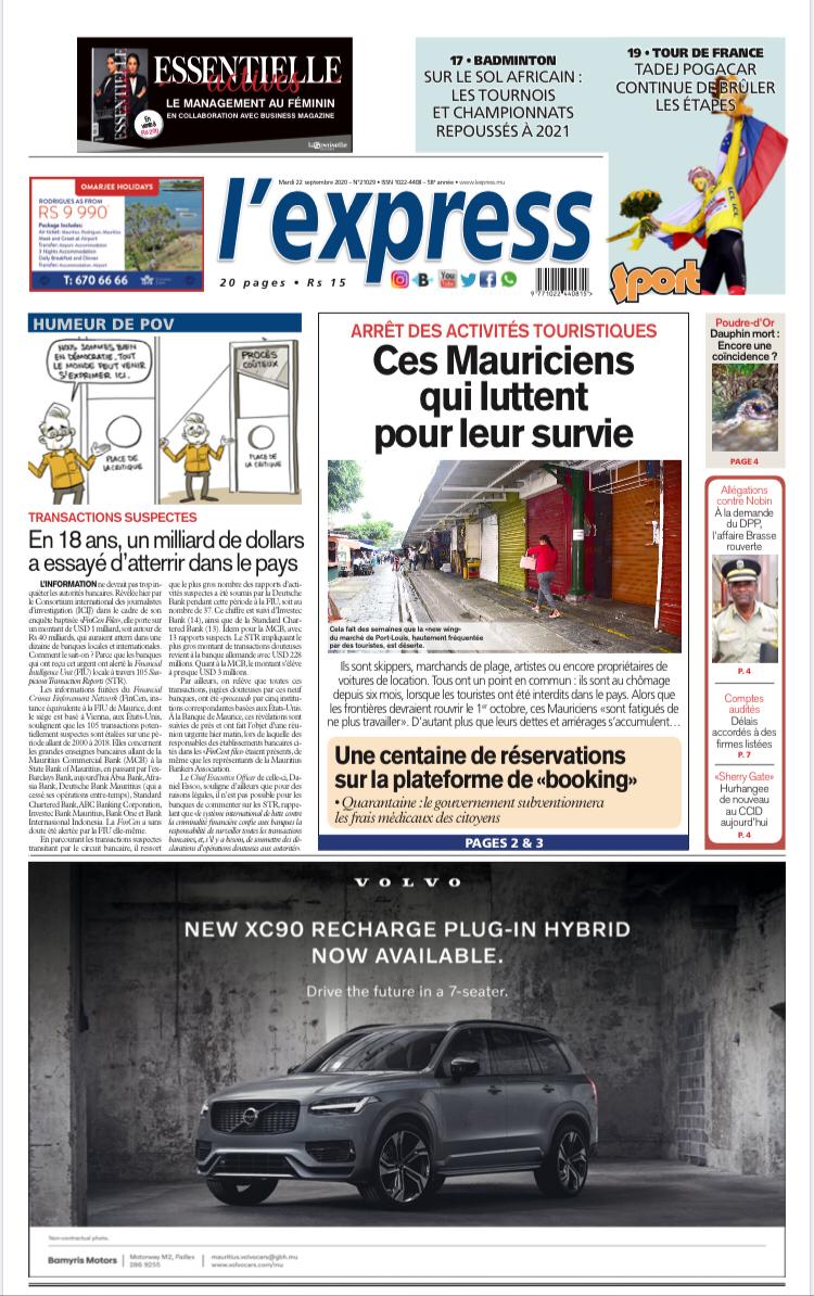 En une de l'express: Arrêt des activités touristiques: Ces Mauriciens qui luttent pour leur survie; Autre titre: Une centaine de réservations sur la plateforme de «booking».