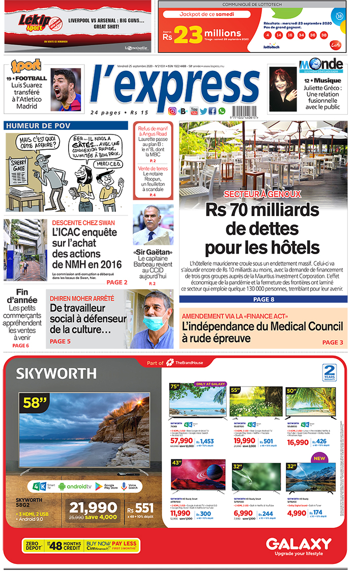En une de l'express : Secteur à genoux : Rs 70 milliards de dettes pour les hôtels ; Autre titre : Descente chez Swan: L’ICAC enquête sur l’achat des actions de NMH en 2016.
