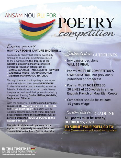Le concours est ouvert aux Mauriciens d’ici ainsi qu’à la diaspora. Les oeuvres seront jugées par un panel comprenant Ananda Devi, Eileen Lohka et Khal Torabully, qu’on ne présente plus dans le milieu littéraire. Les meilleurs poèmes seront publiés dans un recueil qui retracera l’épisode Wakashio et le déversement d’huile.