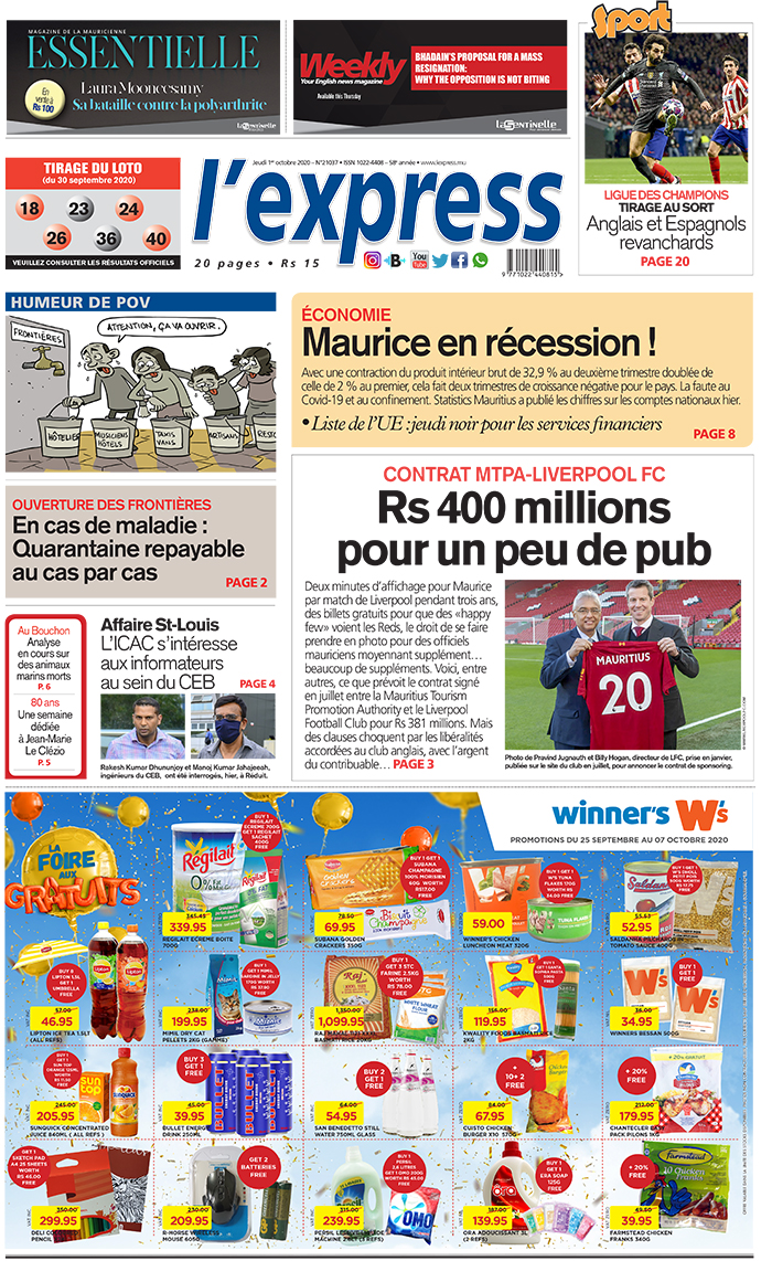En une de l'express: Contrat MTPA-Liverpool Fc : Rs 400 millions pour un peu de pub ; Autre titre : En cas de maladie : Quarantaine repayable au cas par cas.