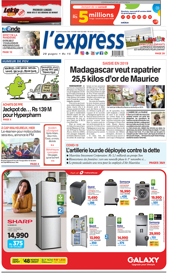 En une de l'express : Saisie en 2019 : Madagascar veut rapatrier 25,5 kilos d’or de Maurice; Autre titre : Achats de PPE : Jackpot de… Rs 139 M pour Hyperpharm.